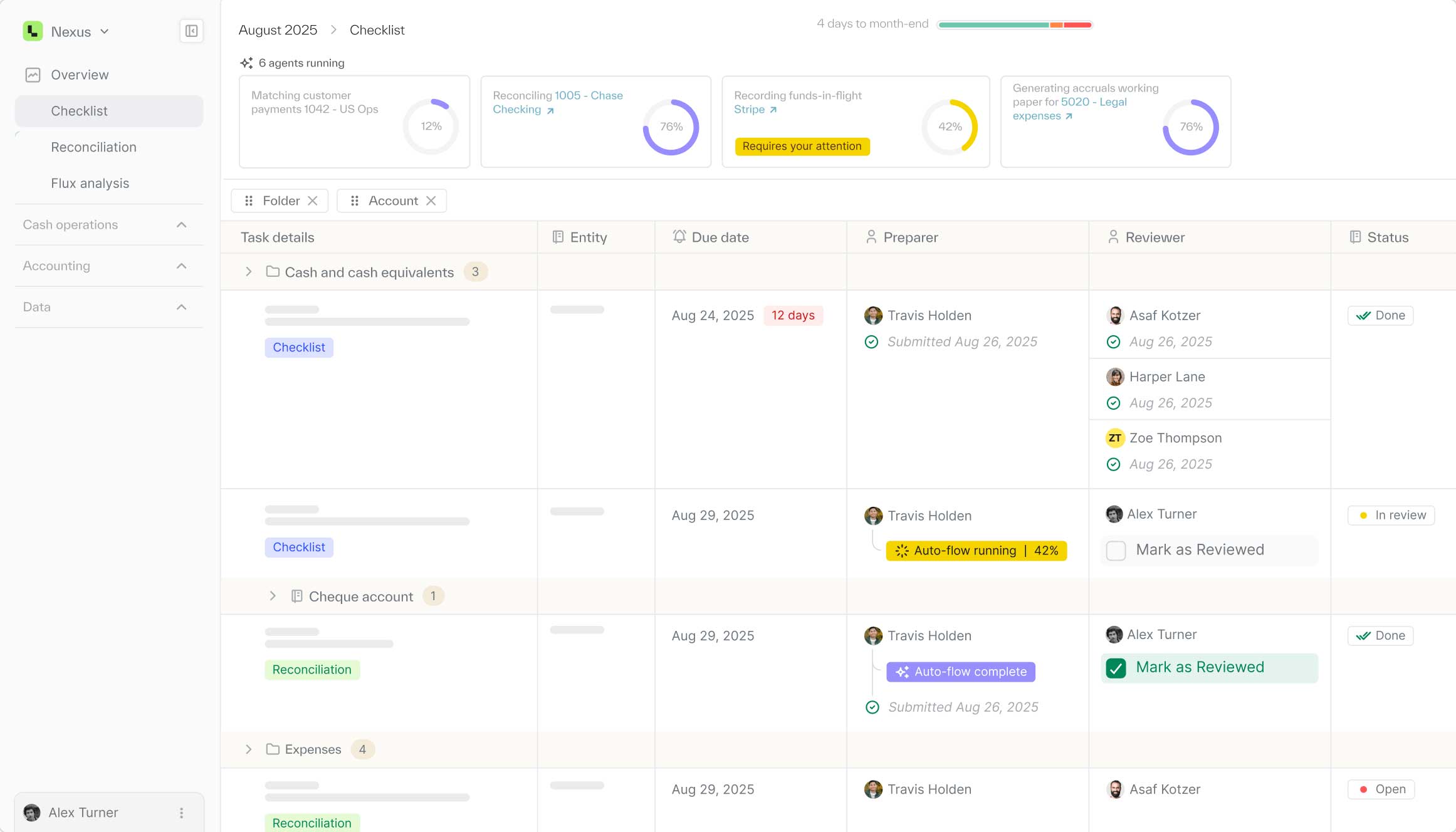 The checklist itself is agentic: tasks come pre-completed with draft working papers, reconciliations, JEs, & flux, with risks flagged automatically, and approvals tracked in-platform.