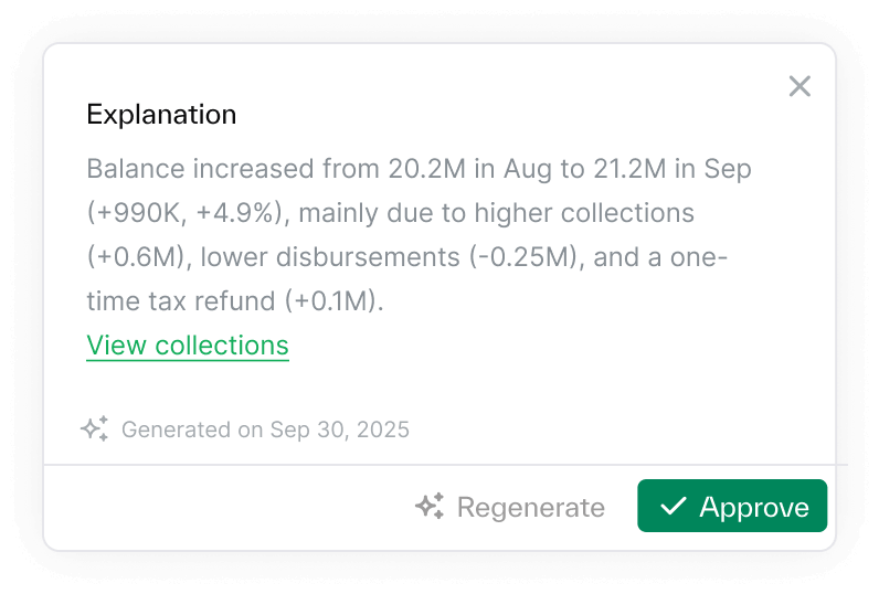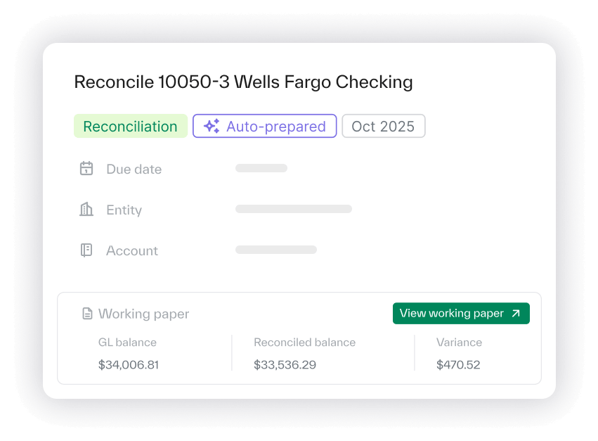 Reconciliations, journal entries, working papers, and flux explanations come pre-populated with data and draft work — so you never start from scratch