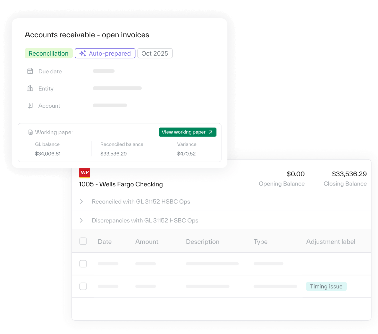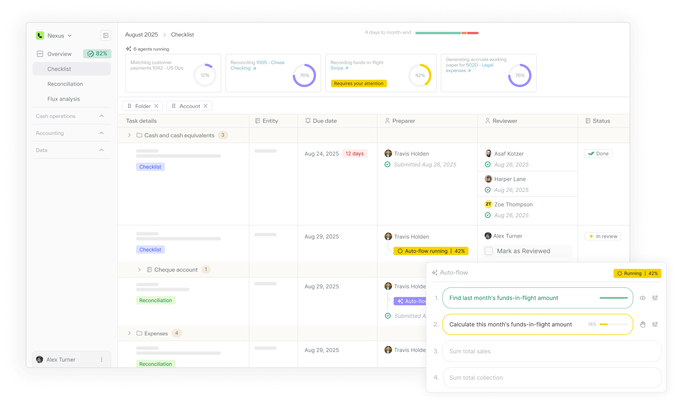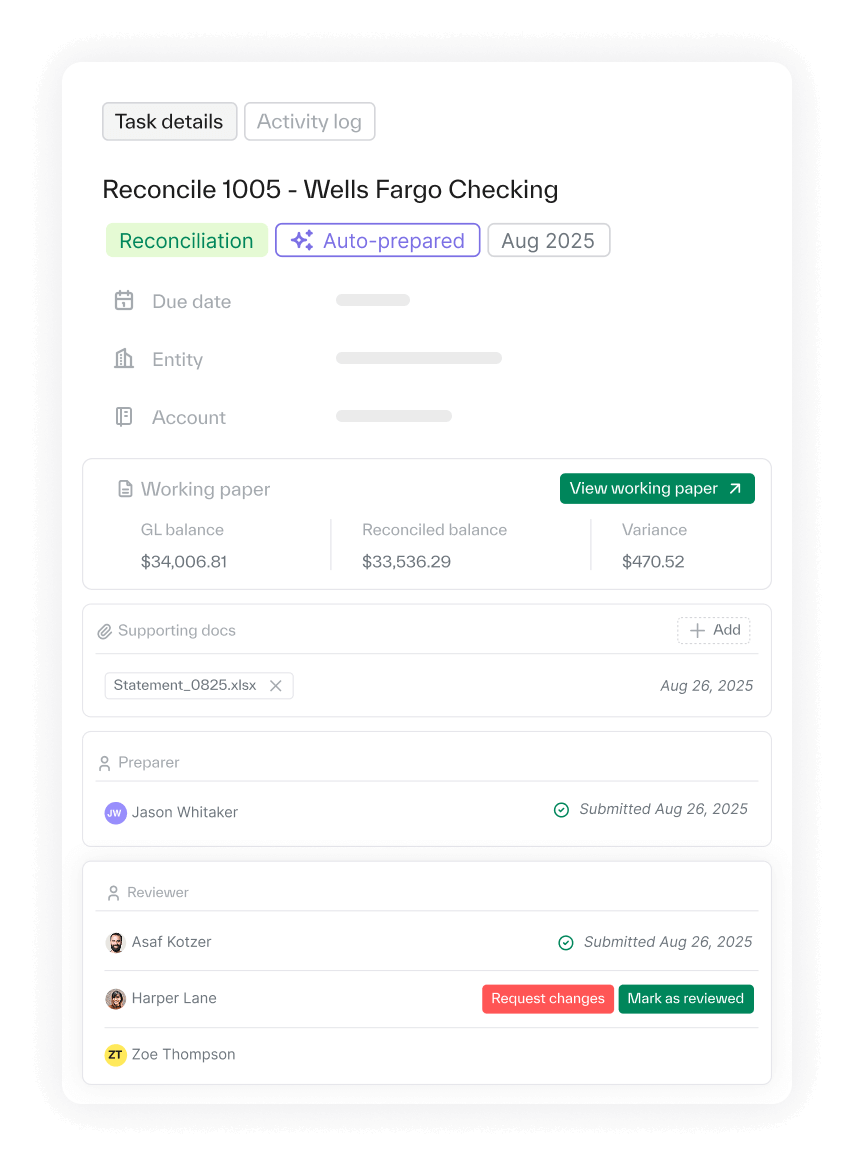 - Tasks open pre-populated with reconciliations, entries, and supporting data — not blank templates