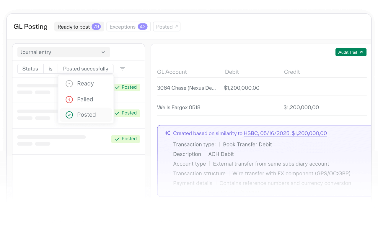 - Posted straight to your ERP with built-in approvals, and every entry linked to supporting docs for a complete audit trail