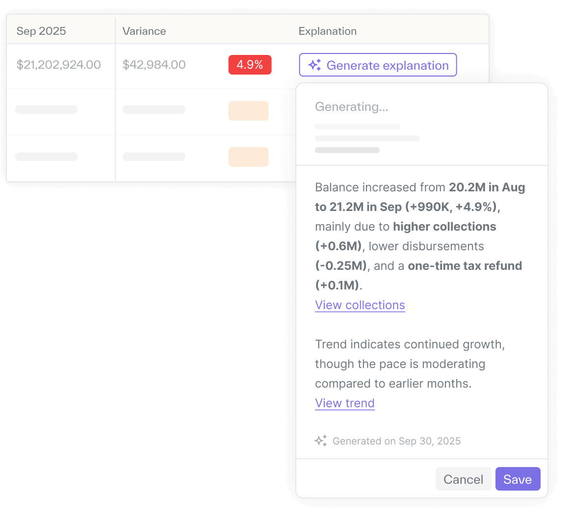 - Give finance leaders and auditors clear variance narratives sooner