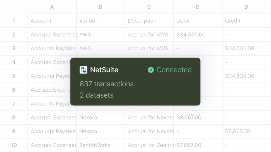 - Pull purchase orders, bills, prior accruals, journals, and more directly from NetSuite, banks, HRIS, AP, and hundreds of other integrations