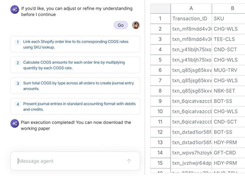 Whether your process uses POs, bills, payroll data, allocations, entity rules, or something unique to your business, the agent follows your exact approach.