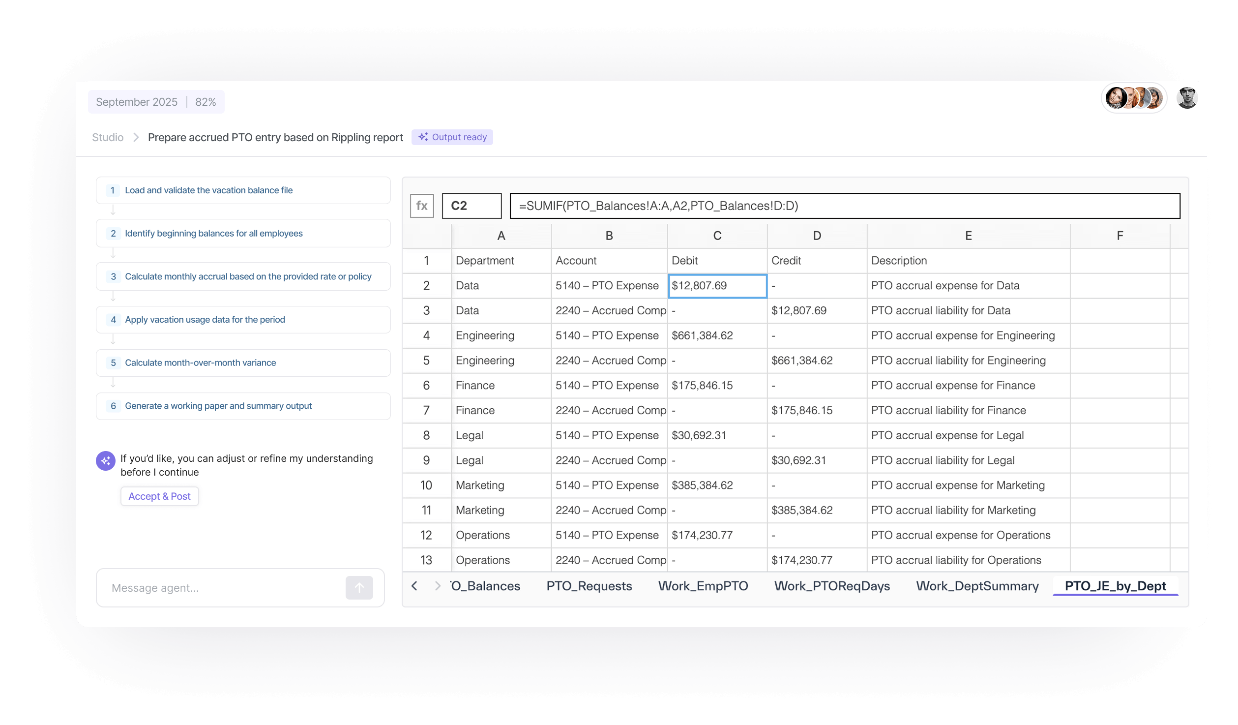 - Generate journal entry lines automatically from the working paper the agent generates — no manual copying or reformatting